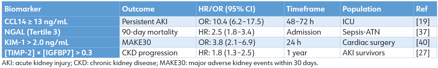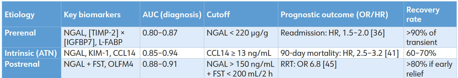 Low levels of baseline damage markers, such as NGAL and KIM-1, indicate a greater than 90% probability of complete recovery within 48 hours. [33] Their sustained elevation, despite hemodynamic optimization, correlates with a heightened risk of 30-day readmission (HR: 1.5–2.0) and CKD (OR: 1.8). [34] In sepsis, plasma PENK levels correlate with mortality in overt AKI (HR: 2.1), enabling early intervention. [35]