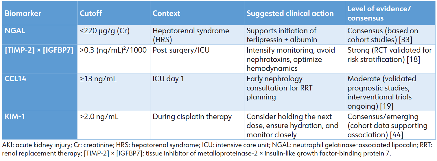 Extensive randomized controlled trials: To evaluate biomarker-directed intervention bundles (e.g., NGAL with FST in obstructive AKI, CCL14 for RRT weaning) across various patient populations.